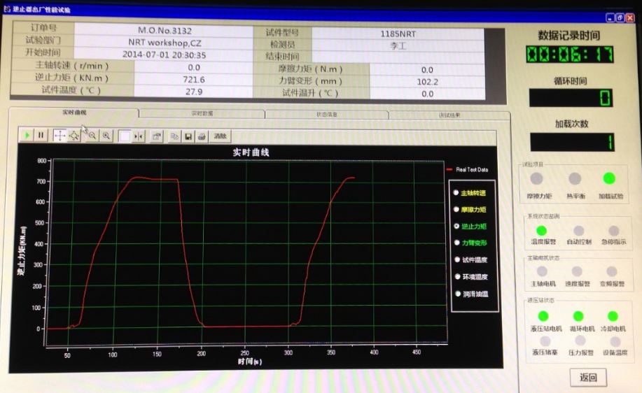 度加载一次。通过伺服电机和气缸实现逆止器自动旋转定位和自动插拨销,从而实现对逆止器的全自动加载试验。可进行各系列逆止器产品的静态扭矩加载测试,空载阻力矩测试,逆止器温升测试等。双量程传感器,最大逆止加载力矩