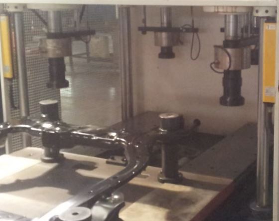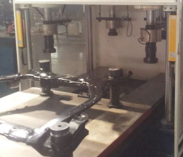 用于汽车副车架衬套的压装。副车架自动送入压装工位,四轴独立控制。可实时显示各压头的压装位移和压装力值,可在不同位置设定压力范围,超范围或压装不到位自动报警,光栅安全防护。适用于不同型号车架衬套的半自动压装。