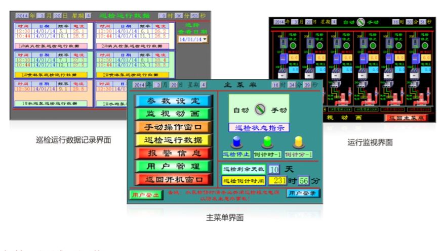 消防安全巡检系统用于企事业单位和高层住宅消防系统日常自动或手动巡检,系统采用可编程控制器、变频调速器及人机界面等控制技术,对消防水泵进行定周期、定时间、定转速的巡检,及时发现问题,使消防水泵长期保持在可靠运行状态。系统符合国家标准GB16806-2006《消防联动控制系统》和公安部安全行业标准GA30.2《固定消防给水设备性能要求及试验方法》的相关规定。